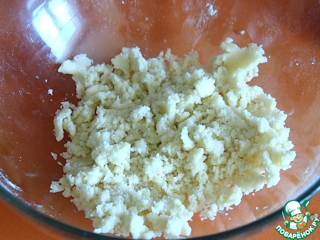 Приготовить штрейлель. Для этого смешать масло, сахар и муку и сделать пальцами крошку. -