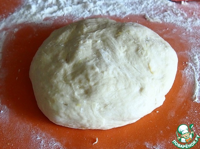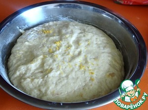 В теплом молоке растворить половину сахара, дрожжи и две ложки муки. Поставить в теплое место на 10-15 минут до образования шапочки. Остальную муку смешать с остальным сахаром, щепоткой соли, цедрой половины лимона.