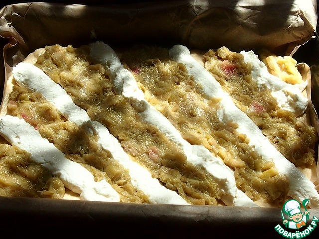 Ложкой или через кулек выложить на тесто творог, делая полоски под углом на расстоянии примерно 4 см друг от друга.