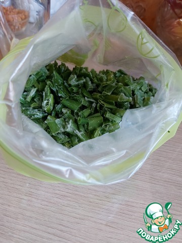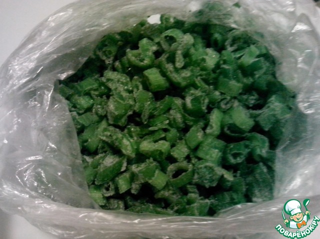 Это первый вариант : у меня маленькие пакетики, хватает на пару раз, берём лук пересыпаем в пакетик, приминаем руками, чтоб из пакета вышел весь воздух и плотно закручиваем, убираем в заморозку, я использую в салатах, супах, соусах и т. д, экономит место в заморозке.