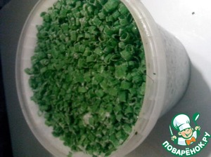 Второй способ:весь лук перекладываю в банку -контейнер, плотно закрываю и в морозилку, так как у меня большой холодильник мне места хватает и под такие баночки.
