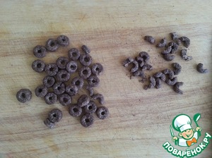 Взять кукурузные шоколадные хлопья, у меня воздушные кольца, разрезать пополам.