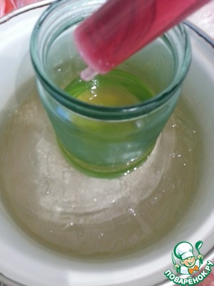 Для "икры". Часа на 3 поставить в морозилку растительное масло и чашку с водой. Взять 50 мл. вишневого сока. Из прозрачного сока получается прозрачная, как натуральная, икра. Для этого, засыпать вишню без косточек сахаром, слить выделившийся прозрачный сок. Если будете брать свежевыжатый сок, то в него добавить сахар во вкусу. Замочить 2 ч. л. желатина в 3 ст. л. воды, распустить желатин на маленьком огне и смешать с соком.