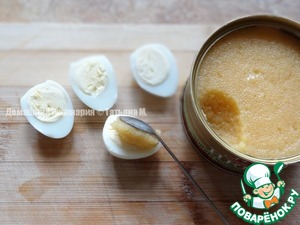 Яйца разрезать пополам и выложить сверху половинок икру;