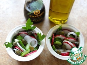 К салату добавить каперсы, полить маслом и соевым соусом;