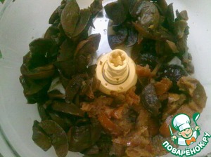 После того как пшено настоялось, бросаем наши фруктики (ягодки) от компота в блендер. У меня были вот такие тёмненькие сухофруктики.