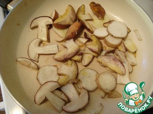 В керамическую сковороду налила масло и выложила грибы. Обжарила их пару минут.