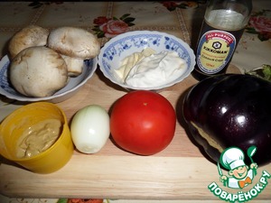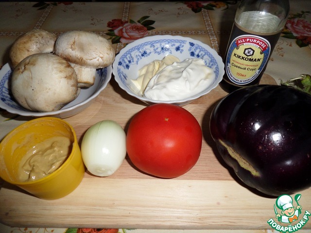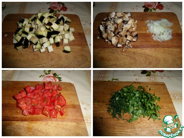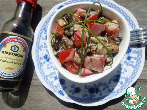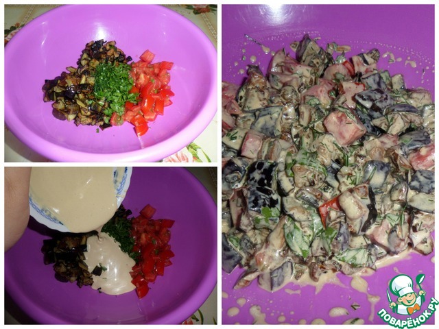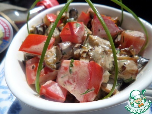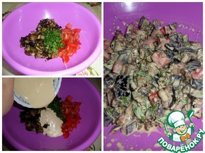 В рабочую чашку выкладываем обжаренные с луком грибы, баклажан, помидор, зелень. Добавляем приготовленную заправку. Аккуратно перемешиваем.