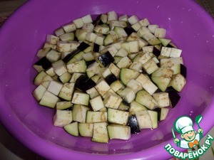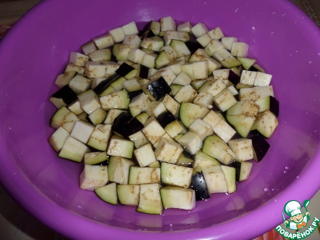 Нарезанный баклажан заливаем водой и оставляем на 10 минут.