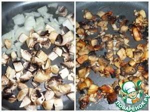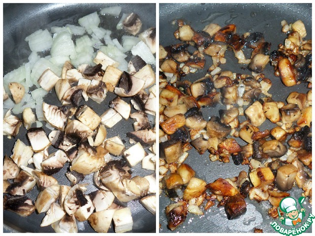 В сковороду наливаем 2 ст. л. растительного масла, выкладываем лук и грибы. Обжариваем до готовности.