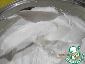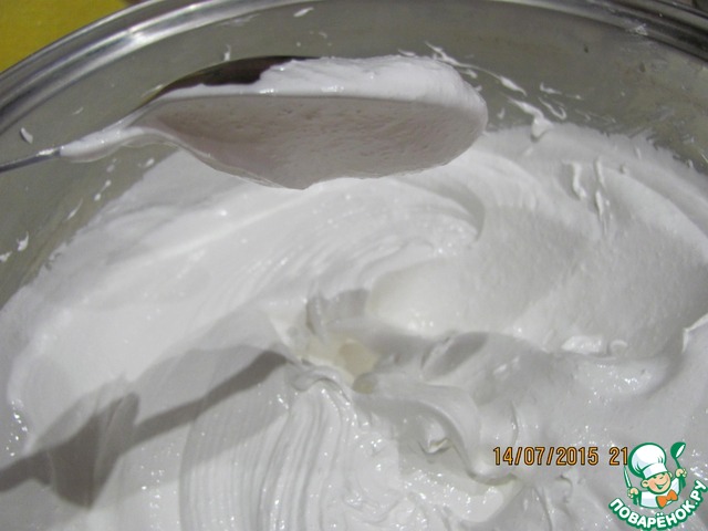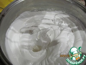 Готовность белково-сахарной смеси определяю просто - перевернув форму для взбивания, и яично-сахарная смесь, остается на месте. ( или можно ложку со смесью перевернуть, но не так эффектно :) )