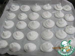 Выстелить противень бумагой для выпечки, и столовой ложкой (или отрезав уголок у обычного полиэтиленового пакета) разложить наши будущие пирожные на лист. У меня в этот раз замес был из 10 белков и 670г сахара, получилось 2 больших листа безе (80 штук).
