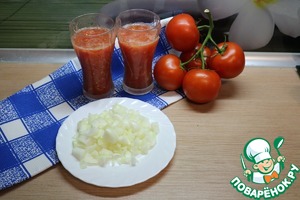 Из помидор делаем томатный сок с мякотью. Лук мелко нарезать.
