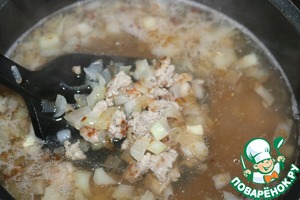 В кипящую воду выкладываем обжаренный фарш.