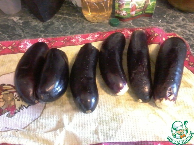 Баклажаны чистим от плодоножки, моем и сушим полотеничком (у меня баклажанов 6 так как они очень маленькие)