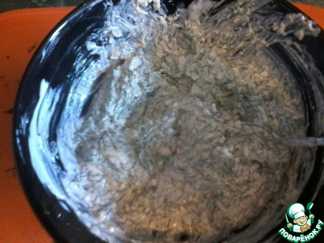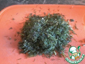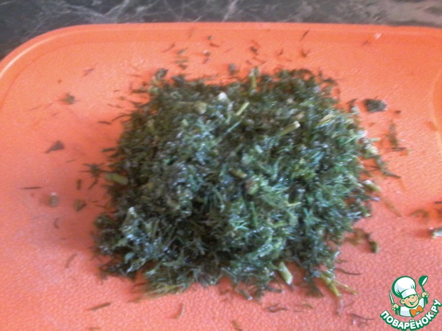 В это время готовим начинку. Зелень моем, встряхиваем над раковиной от лишней влаги и мелко рубим