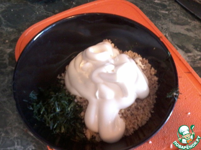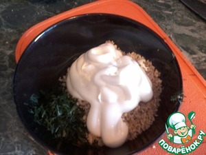 Зелень, чеснок и орехи кладем в пиалу, добавляем майонез