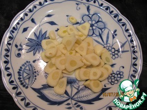 Сделать по всей рульке надрезы ножом. Положить в эти "кармашки" ломтики чесночка.
