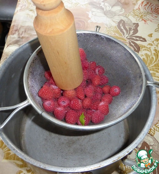 Не надо мыть, не надо перебирать и избавляться от личинок малинового жучка (если таковые вдруг обнаружились). Возьмем железное сито и кастрюлю. И насыпаем в сито порцию наших ягод. Не сыпьте доверху - неудобно будет перетирать.