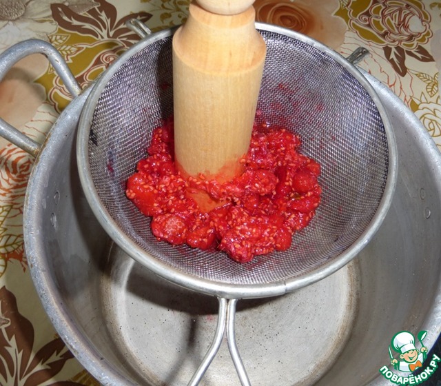 Должен остаться как можно более сухой жмых. Фактически одни семечки малины. Жмых выкидываем и кладем следующую порцию ягод. Так перетираем все ягоды.