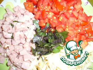 В это время подготовим продукты, которые сделают наш хлебушек ароматным и пикантным: натрем сыр (я брала копченый), мелко порежем листики базилика и помидорки (семена лучше выдавить).