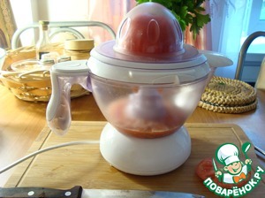 Берём большой помидор и выжимаем из него томатный сок. Я отжала сок в соковыжималку для цитрусовых.
