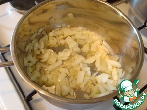 Берём сотейник, наливаем в него оливковое масло и выкладываем лук. Золотим его.