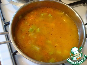 Наливаем туда же бульон или просто воду, солим и варим до готовности ещё минут 10. Добавляем специи (ваши любимые), по желанию жгучий перец и готовим ещё парочку минут.