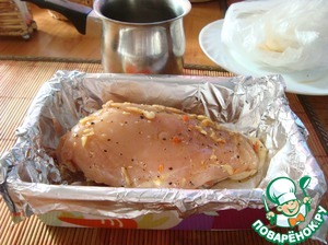 Берём форму и застилаем её фольгой. Выкладываем в неё грудку, а маринад сливаем в какую нибудь ёмкость из пакета. Ставим в духовку на 30 минут при т-180 С.