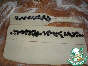 Тесто раскатать около 3-5мм. Разрезать на полоски шириной 7-8см. Положить по середине ягоды (у меня были смородина и вишня) и посыпать сахаром, защипнуть как колбаску.