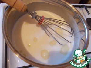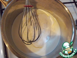 Сливки смешать с сахарной пудрой, поставить на огонь, довести до кипения, варить, помешивая, на медленном огне 5 минут.