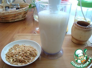 Хорошо разбить, добавить порезанный банан и мёд. Всё соединить.