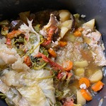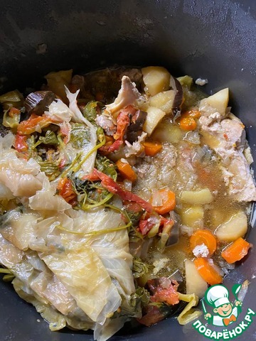 Когда снимешь верхний слой овощей, открывается вот такая картина. Показался бульон, хотя мне больше нравится «соком дымлямы» это великолепие называть.