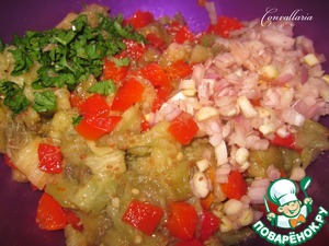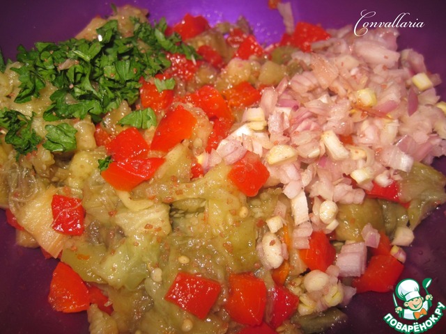 Баклажаны и болгарский перец нарезать кубиками, добавить измельченный репчатый лук и петрушку, щепотку соли. Аккуратно перемешать.