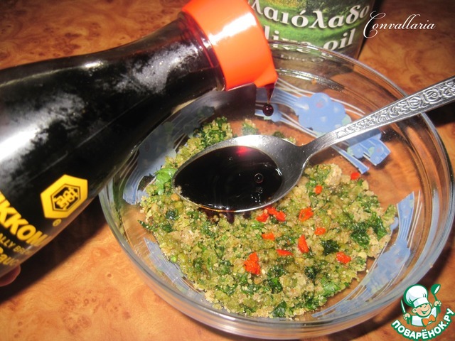 Для орехового соуса: грецкие орехи, чеснок и петрушку прокрутить через мясорубку. Добавить к ним мелко нарезанный перец чили (без семян), соевый соус, оливковое масло и воду.