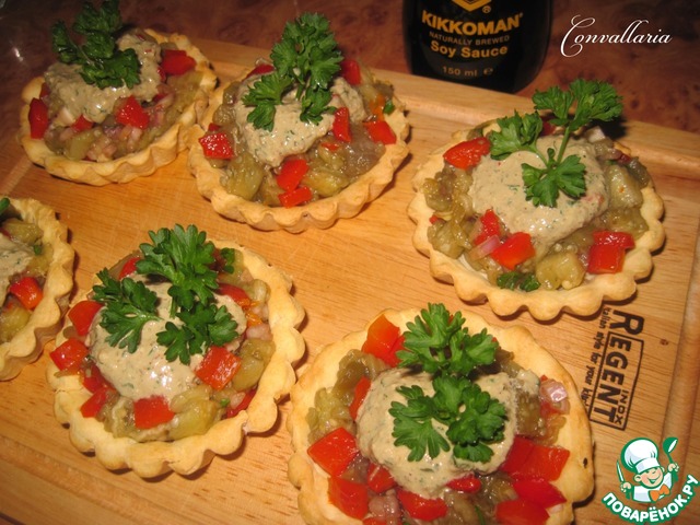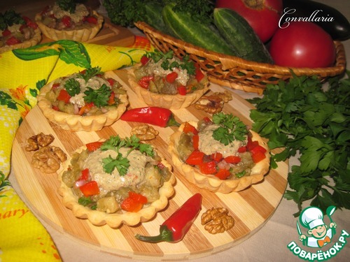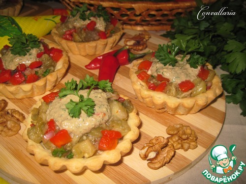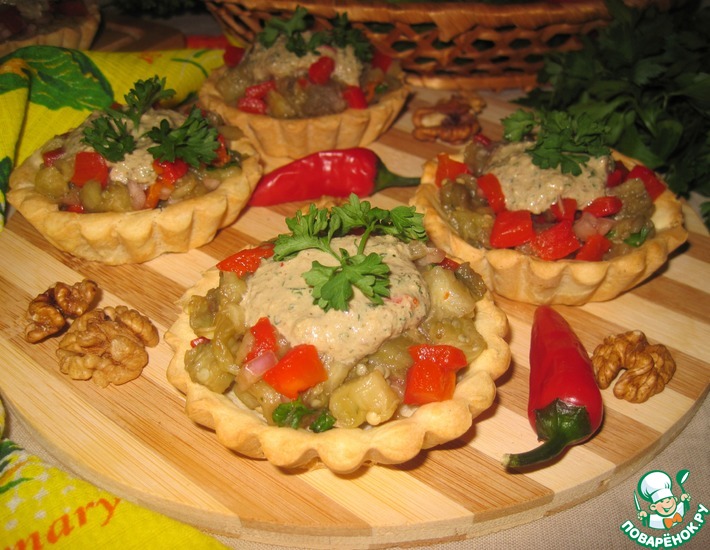 Нежный салат из запеченных баклажанов и болгарского перца с добавлением ароматного орехового соуса подается в рассыпчатых порционных тарталетках.