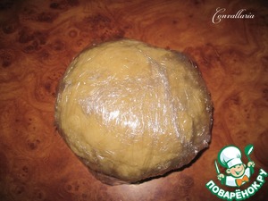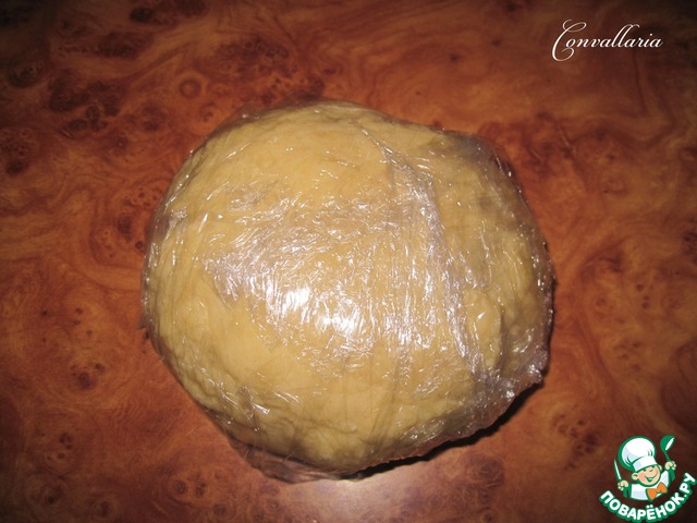 Смешать сливочное масло и яйцо, постепенно добавить просеянную муку, воду и соль. Замесить тесто, завернуть в пищевую пленку и убрать в холодильник на 30 минут. -