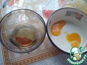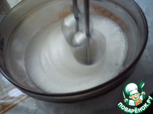 Белки достаем из холодильника, добавляем щепотку соли и начинаем взбивать миксером до образования густой пены. Добавляем к творожной массе