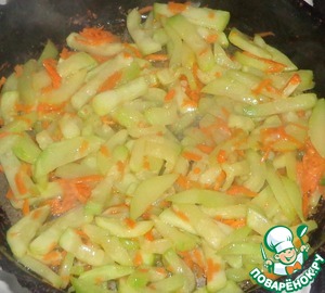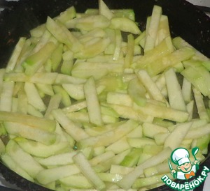 Молодой кабачок порезать небольшими кусочками. На сковороду наливаем небольшое количество растительного масла и высыпаем кабачки. Помешивая обжариваем 2-3 минуты.