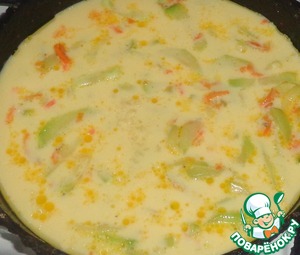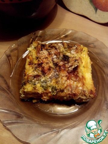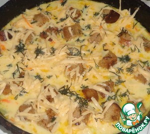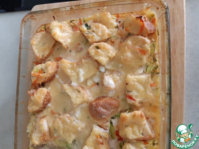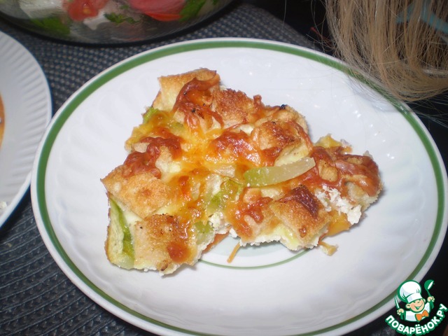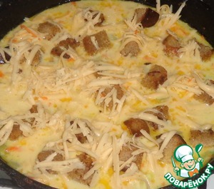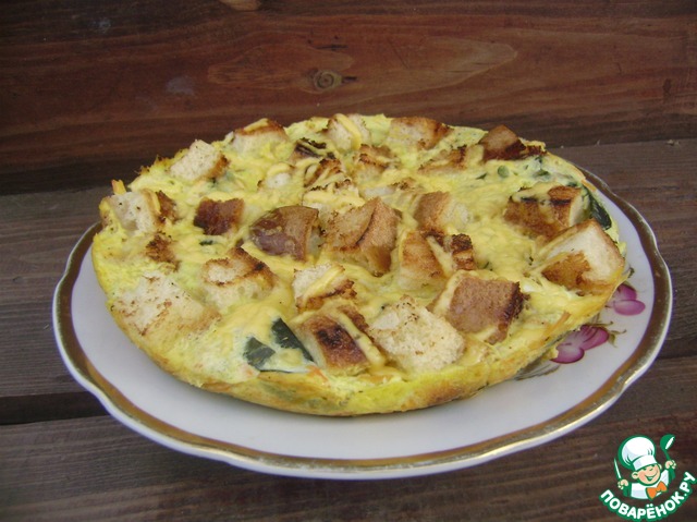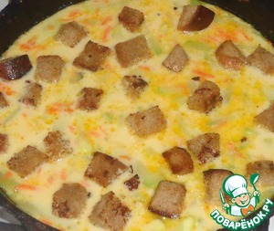 Ароматное и сытное блюдо из молодых кабачков, золотистых сухариков в яичной заливке.