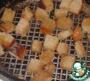 Смешиваем небольшое количество растительного масла с лимонным соком и выливаем в сковороду. Хлебные ломтики порезать на кусочки и обжарить на сковороде до появления золотистого цвета.