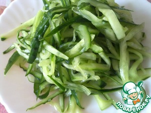 Огурцы помыть и разрезать поперек на половинки. Удалить ложечкой сердцевину, нарезать тонкими полосками. |