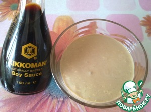 Тщательно перемещать в миске майонез, хрен и натурально сваренный соевый соус "Kikkoman". |