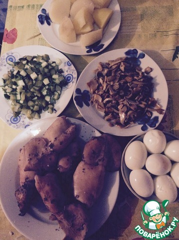 Отварить картофель в мундире, яйцо и кальмара. Грибы обжарить, до золотистого цвета.