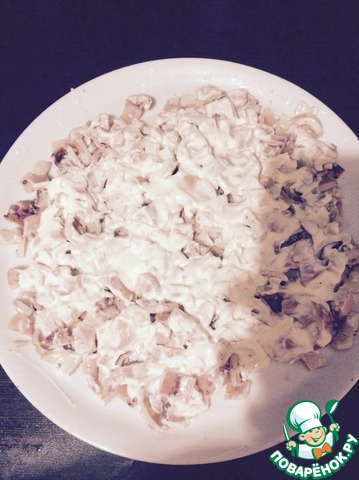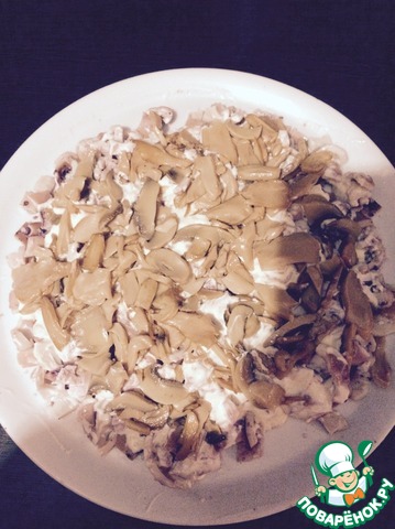 Вторым слоем выложить обжаренные грибы. Смазать майонезом.