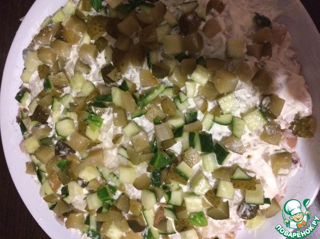 Четвертым слоем, мелкопорезанные огурцы, смазать майонезом.