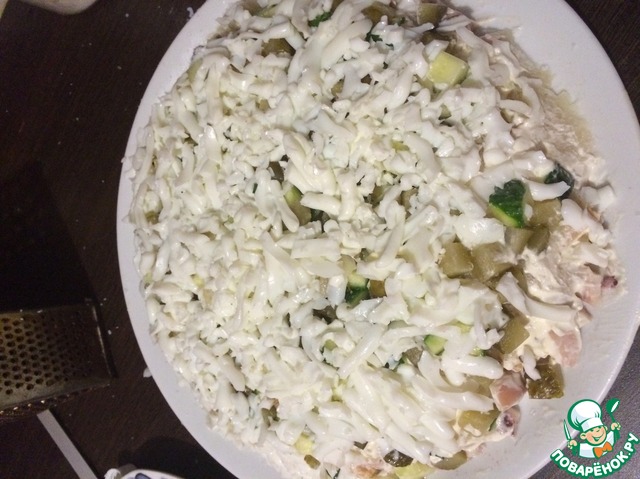 Пятым слоем, белки, натертые на терке. Смазать майонезом.