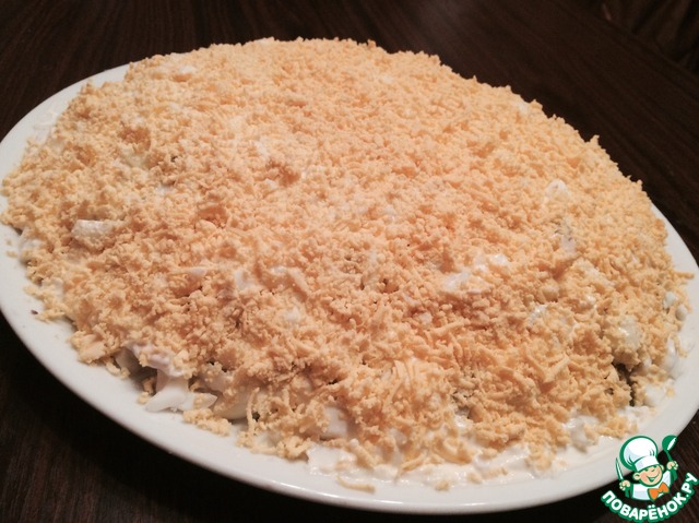 И последним слоем желтки натертые на мелкой терке. И украсить по вашей фантазии)))