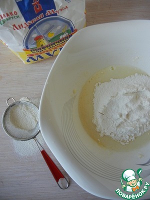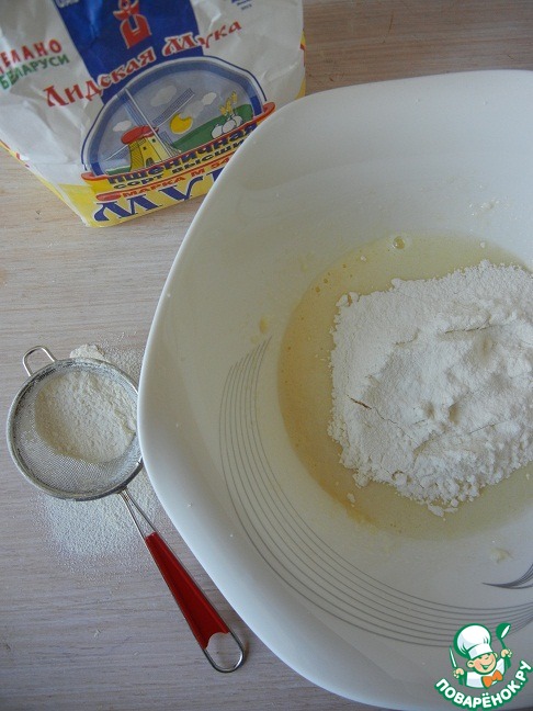 В большую миску просеиваем муку и разрыхлитель, добавляем соль и перемешиваем все сухие ингредиенты