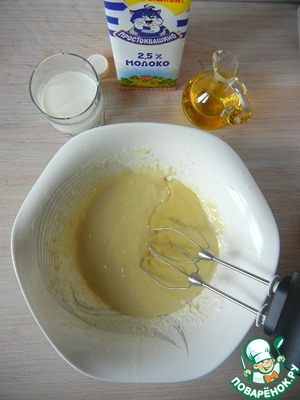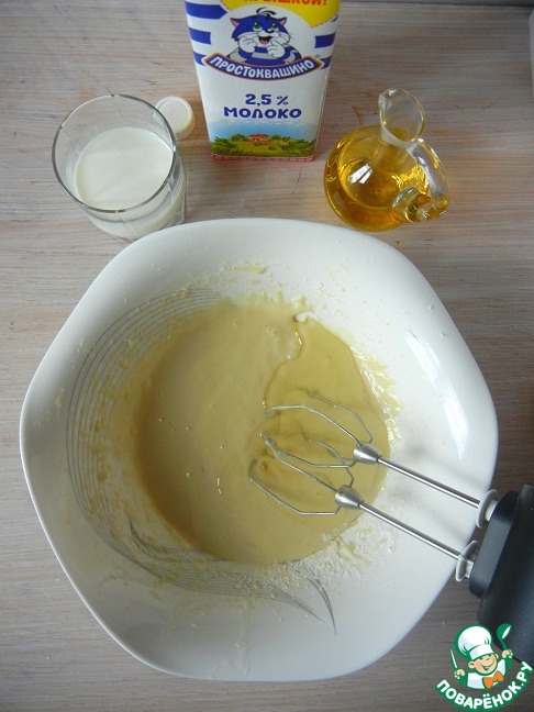 К сухим ингредиентам добавляем сыр, взбитый с сахаром, молоко и растительное масло (его можно заменить на сливочное) и хорошенько перемешиваем тесто. Оно получится достаточно густым.